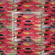 Flippiges Weltraumzeitalterovalgewebe mit Dreiecken. Farben von Gelbem, von weißem und von Schwarzem auf einem roten, strukturierten Blickhintergrund. Mitte des Jahrhunderts inspirierter Gewebeentwurf. Alle Grafiken durch Gail Gabel, LLC.