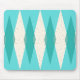 Die moderne Mousepad Raute aus dem Mittelalter besticht durch einen lebendigen, türkisfarbenen Hintergrund und ein Muster aus Mod, durchsichtigen aquamarinen Diamanten, die über größere, Vintage Cremetamortien mit goldfarbenen Speckfilmen aus dem Weltraum hinausragen. Diese minimalistisch , dekonstruierte Raute ist ein simplistischer Rückschlag aus dem Zeitalter der Atomenergie größer als das Leben, das die verzierende Landschaft der 1950er und 1960er Jahre dominierte. Dieses kitschige Design erinnert an alles, von den Schildern der Retro Palm Springs-Bowling-Gasse bis zu den Fernsehgeräten, die Sie bei Ihrer Großmutter benutzt haben.