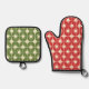 Mitte Jahrhundert Moderne Weihnachtsstars Retro Atomic Muster Oven Mitt & Pot Holder Set. Feierliches, modernes Design in der Mitte der Mod, in den typischen Weihnachtsfarben: Rot, Olivengrün und Creme. Ideal für Feierlichkeiten oder als Geschenk für den Koch zu jeder Zeit. Von Kierkegaard Design Studio.