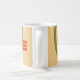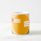 Diese Tasse hat ein modernes abstraktes Design eines goldenen Kreises in einem grünen Kreis mit orangefarbenen und weißen Streifen.