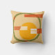 Dieses Kissen hat ein modernes abstraktes Design von einem goldenen Kreis in einem grünen Kreis mit orangefarbenen und weißen Streifen.