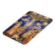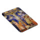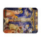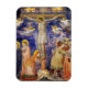 Mittelalterliche Karfreitagsszene mit Christus am Kreuz umgeben von Engeln. Richtig gefärbt in Blues, goldgelb und orange.