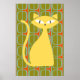 Dieses lustige Poster zeichnet sich durch ein gewagtes Retro-inspiriertes Design in Orange-, Oliven- und Blautönen mit einer hellgelben Katze aus.
