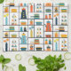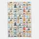 Schmale, minimalistische, moderne Retro-Küchenregale mit Tassen, Kaffeekanne, Kaffee- und Teekonistern, Geschirr, Pfannen und Kuchen. Lass mir, ob du eine andere Skala für das Muster haben willst. Ich würde Liebe haben, mein Design in der Welt zu sehen - markiere mich auf IG @parry_vegan.