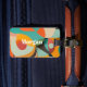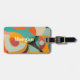 Moderne Malerei aus dem Mittelalter in verschiedenen geometrischen Formen in Rot, aquamarin, Orange, Schwarz und Grün mit fett weißem Monogramm oder Namen mit Kontaktdaten auf der Rückseite.