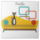 Moderne, im Stil der 50er Jahre, schwarz-weiße Katze aus der Mitte des Jahrhunderts, die auf einem Sofa sitzt. Abstrakte Formen. Bearbeitbarer Text.