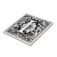 Mittelalterliche Illuminierte Letter-I-Keramik Tile Eine Schwarz-Weiß-Vektor-Abbildung des Briefes in einem aufwändigen mittelalterlichen Stil, erstellt im Stil von Albrecht Dürer. Das Design ist ein Quadrat mit einem großen Blumenmotiv, umgeben von symmetrischen geometrischen Mustern und Wirbel.
