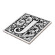 Mittelalterliche Illuminierte Letter J Keramik Tile Eine Schwarz-Weiß-Vektor-Abbildung des Briefes in einem aufwändigen mittelalterlichen Stil, erstellt im Stil von Albrecht Dürer. Das Design ist ein Quadrat mit einem großen Blumenmotiv, umgeben von symmetrischen geometrischen Mustern und Wirbel.