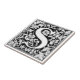 Mittelalterliche Illuminierte Letter S Keramik Tile Eine Schwarz-Weiß-Vektor-Abbildung des Briefes in einem aufwändigen mittelalterlichen Stil, erstellt im Stil von Albrecht Dürer. Das Design ist ein Quadrat mit einem großen Blumenmotiv, umgeben von symmetrischen geometrischen Mustern und Wirbel.