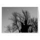 Ein stimmungsvolles Schwarz-Weiß-Foto eines Baumes, der mit einem Halbmond gegen einen Nachmittagshimmel geschmückt ist. Der Baum scheint einen seltsamen Naturgeist zu verkörpern, der zu einer Art mittelalterlicher Musik tanzt.