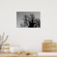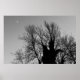 Ein stimmungsvolles Schwarz-Weiß-Foto eines Baumes, der mit einem Halbmond gegen einen Nachmittagshimmel geschmückt ist. Der Baum scheint einen seltsamen Naturgeist zu verkörpern, der zu einer Art mittelalterlicher Musik tanzt.