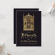 Diese Vintage Schwarz-Gold-Einladung zu einer mittelalterlichen Geburtstagsparty hat im oberen Teil ein mittelalterliches Schlosstor zwischen zwei gotischen Türmen, bewacht von zwei Rittern in Rüstungen, mit Halberds. Darüber befinden sich zwei weitere Ritter in Rüstung, Reiten, Fahnen tragen, und in der Mitte über dem Tor befindet sich ein heraldischer Löwe. Der Text ist in goldenen Buchstaben unter der Abbildung geschrieben. Der Name und das Zeitalter sind mit gotischen Schriftart im mittelalterlichen Stil geschrieben. Der Hintergrund ist schwarz. Das Vintage Schwarz-Gold-Bild mit gotischer Dekoration stammt von einem antiken Buchcover "Marmion, a Tale of Flodden Field" von Sir Walter Scott aus dem Jahr 1839, das jetzt im öffentlichen Bereich zu sehen ist.