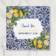 Handgemalte traditionelle Fliesen aus Portugal mit mediterranen Zitronen. Azulejo blaue und weiße Blumenblätterfliesen Kunstwerke. Ein wunderschönes mediterranes Design, das gelbe Zitronen mit Grün und Blüten im Vintagen portugiesischen Blau und Weiß darstellt. Der Hochzeitstext ist elegant gerahmt mit weißer geometrischer Form. Einzigartiges Design der Gastgeschenk Hochzeit Azulejo in Blau und Weiß mit modernen Elementen. Auch die passenden Hochzeitseinladungen und andere Schreibwaren sind verfügbar.
