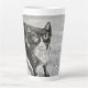 Mitten Schwarz-Weiß-Katze auf latter Tasse