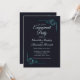 Eine elegante, tiefblaue Mitternachtsfeier mit türkisfarbenen, verzierten, blumengeschmückten Ecken, die die Einladungdetails abbilden.