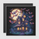 Das Bild zeigt nachts ein stilisiertes Spuk Haus. Das Haus ist groß, mit spitzen Dächern und mehreren Fenstern, die ein gelbes Licht ausstrahlen, was auf eine innere Beleuchtung hindeutet. In der Umgebung des Hauses befinden sich zahlreiche Fledermäuse, die gegen einen dunklen Himmel fliegen. Im Vordergrund befindet sich ein Friedhof mit Grabsteinen, der die unheimliche Atmosphäre der Szene noch verstärkt. Dieses Bild ist interessant wegen seiner thematischen Elemente, die häufig mit Horror oder Halloween assoziiert werden, und seiner lebhaften, aber dunklen Farbpalette, die eine unheimliche Stimmung Set.