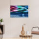 In der Bucht eines gefrorenen Landes schwimmt ein großer Eisberg im kalten blauen Meer. Schneeflocken und Sterne stören die Szene, und am Himmel leuchtet das Polarlicht in Rosa, Lavendel, Grün und Blau.