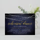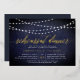 Unsere eleganten Probe-Dinner oder Cocktail-Party Einladungen in schicken Mitternacht-Blau und Weiß verfügen über einen reich strukturierten Mitternachtsblauen Hintergrund mit weißen Lichterketten über die Oberseite, und "Probe Dinner" in schicker Goldfolie-Kalligraphie-Schrift Typografie. Personalisieren Sie Ihre Zeremonie Probe und Probe Dinner Details unten. Enthält Platz für den Zeitpunkt der Probe und die Kirche- oder Veranstaltungsadresse. Ein elegantes Design in dunkler Marine und weiß für moderne Paare und elegante Events.