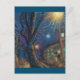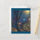 Postkarte mit dem kleinen Stadtbild im expressionistischen Stil Midnight Sun, Nachtstraßen, riesigem Baum, leuchtenden Lichtern und halb schlafenden Häusern. Pastellmalerei in Schwarz, Blau, lila und Gelb, 2021 © ClipsoCallipso / Julia Khoroshikh www.juliakhoroshikh.art #nightlandscape #nocturne #nightpainting #landscapainting #modernisionism #postcards #greetingcards