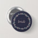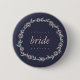 Identifizieren Sie die Hauptakteure in Ihrem Brautparty - besonders die Braut! - mit unseren eleganten, süß-schicken Blumenknöpfen. Das Design zeichnet sich durch einen dunkelblauen Hintergrund und einen Kranz aus blassrosa Blume und schlaugrünen Blätter aus, und "Bride" koordiniert pastellrosa Kursivschrift.