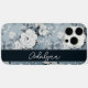 iPhone Case: Schützen Sie Ihr iPhone mit diesem atemberaubenden Blumenkoffer mit großen weißen Blüten und sanft blauen Blätter auf einem hellen, rauchblauen Hintergrund. Das Gehäuse ist perfekt für Liebhaber der Vintagen und Cottagecore-Ästhetik geeignet und verfügt über einen eleganten, handgeschriebenen Schriftart in Weiß auf einem dunkelblauen Banner für Personalisierung. Die schlanke, leichte Bauweise sorgt für eine gute Passform und bietet Schutz ohne Schüttgut.