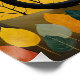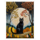 Dieses skurrile und ruhige Kunstwerk besticht durch eine auffallende schwarze Katze als zentrale Figur, sitzend platziert und majestätisch in einer stilisierten, herbstlichen Landschaft. Hinter der Katze dominiert ein massiver, leuchtender Vollmond die Szene und wirft ein sanftes Glühen über sanfte Hügel und einen dunklen, sternigen Himmel. Die umliegenden Bäume sind mit lebhaften, stilisierten Blätter in einer warmen Farbpalette aus Gelb, Gold und Bronze-Orange geschmückt und kontrastieren wunderbar mit den coolen Hintergrundtönen. Das Stück verbindet einen Sinn für magischen Realismus mit einer volkstümlichen Kunstästhetik und schafft so eine faszinierende und ruhige Szene, die mit mystischem Charme gefüllt ist.