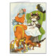 Niedliche Vintage Illustration von zwei Katzen, die an Spielkarten einer Tabelle sitzen. Ein schwarzer Vogel sitzt auf der Rückseite des Stuhls. Eine Katze trägt Gläser und die andere trägt einen Hut.