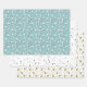 Ein Set von drei Weihnachtsdrucken - weiße Santas auf blau, weiße "Bizzardrucke", Weihnachtsbäume und Sterne auf weiß.