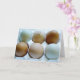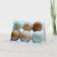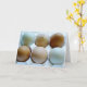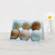 Sechs Eggs, from different breeds of laying chickens. They range in color from pale green blue, to creme, to brown, along with a spotted egg in the mix. Packaged up in Styrofoam eggpappe.