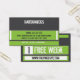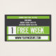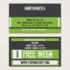 Mixed Martial Art Business Card Free Week Card Visitenkarte mit einem grün-dunkelgrauen Farbschema, modernem Design und starken typografischen Elementen. Auf der Rückseite der Karte steht ein Platzhalter für die Woche zur Verfügung. Platz zum Hinzufügen von Kursen, Gymnastikstunden oder anderen relevanten Informationen. Perfekte Art, die Teilnahme am Unterricht zu fördern, und ein einfaches Marketing-Tool. Ideal für ein gemischtes Kampfsport-Gymnastikstudio, einen Boxgymnastiksaal, einen Kickboxing-Fitnessraum, ein krav maga oder ein Atelier für Kampfsport.