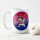 Eine Tasse mit einem Aufkleber eines Hundes im Weltraum, der den Dab macht. Der Hintergrund ist ein Bild einer bi-Flagge.