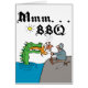 Ein mittelalterlicher Ritter, der auf einem Ufer sitzt, während ein atmendrache des Feuers seesein Huhn und Titel Mmmm… GRILLEN, die auf Grill-T - Shirts verfügbar sind brät, Grill knöpft, Grill-Schürzen und mehr Grillengeschenke.