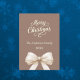 Mocha, brauner Hintergrund, cremefarbener Text und Bogen. Fröhliche Weihnachten wird mit einem eleganten, handgeschriebenen Stil geschrieben. Personalisieren Sie Ihren Familiennamen und fügen Sie ihn hinzu. Zurück: Fügen Sie Ihre Nachricht und Ihre Namen hinzu.
