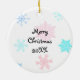 Niedlicher Kawaii-Kaffee, Cappuccino in einer Tasse mit Sahne und blauen und rosa Schneeflocken Weihnachtsschmuck.
