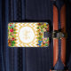 Gießen Sie einen trendy Vibe zu diesem Vintagen Blumenschmetterlingsmonogramm-Gepäckumbau mit einem modernen gelben und weißen Zickzack Muster hinein. Personifizieren Sie Blumen dieses girly Sommers trifft mutige Zickzacke entwerfen, indem Sie Ihre Namens- und mit Monogramm Initiale addieren.