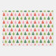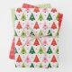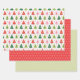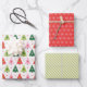 Ein fröhliches und modernes Weihnachtsverpackungs-Set mit 3 Urlaubsmustern. Ein Retro, ein Weihnachtsbaummuster aus der Mitte des Jahrhunderts, ein Schneeflockendesign und ein diagonales, kantiges Streifen-Muster. Die Farben sind rot, rosa, lila grün und dunkelgrün.