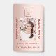 Ein Abzeichen für die Mitarbeiter von Modegeschäften. Eine Rose Gold Imitate metallisch aussehend Hintergrund. Fügen Sie Ihr Foto, Titel, Firmenlogo, Shop-Name hinzu. Zurück: Ihr Text und Strichcode Dieses Abzeichen ist auch in unserem Shop ohne den Strichcode auf der Rückseite erhältlich.