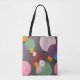 A modern abstract tote bag featuring colorful circular floral shapes set against a deep, dark background.