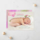Moderne Künstlerische Full Foto Baby Girl Geburtsankündigung. Rosa und grünes Thema mit Wasserfarbenschlag auf der Vorderseite und koordinierte, rosa und grüne Kunstwerke auf der Rückseite perfekt, um die Geburt Ihres neuen kleinen Mädchens anzukündigen. Mit dieser schönen Ankündigung kündigen Sie Ihre neue Ankunft heute an alle Ihre Freunde und Verwandten. Jenns Emporium.