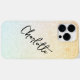 Modern Beach Glitzer Girly Chic Personalisiert Name iPhone 14 Pro Max Smart Phone Cases bietet einen gelben und weich blauen ombre Glitzer Hintergrund mit Ihrem personalisierten Namen in eleganten handgeschriebenen Kalligraphie Skript Typografie. Perfekt als Geschenk für Weihnachten, Geburtstag, Muttertag, beste Freunde, Schwester und mehr. Entworfen von ©Evco Studio www.zazzle.com/store/evcostudio
