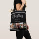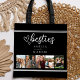 Modern Photo Besties Photo Collage Black and White Tote Bag. Celebrate your cherished friendship with this beautiful 'Besties' photo collage tote bag. Featuring a stylish script font that elegantly spells out 'besties' above a customizable photo collage, this bag is perfect for showcasing your favorite memories with your closest friend. The design is set against a classic black background, accented with subtle white stripes for a touch of sophistication. This tote is ideal for carrying your everyday essentials while keeping your treasured moments close. Make it uniquely yours by adding your favorite bff photos and names, creating a meaningful keepsake or a thoughtful gift for your best friend.