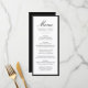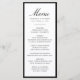 This wedding menu features “Menu” displayed in elegant black calligraphy script with the couple’s names, wedding date, and menu selections arranged below in refined serif lettering. A bold black border frames the design, creating a clean and structured presentation that feels timeless and sophisticated. The balanced layout offers a polished way to showcase your reception courses, making this menu card ideal for modern, classic, and formal wedding celebrations. Personalize the text to create a cohesive table detail that complements an elegant wedding setting.