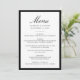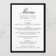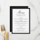 This modern wedding menu features “Menu” in elegant black calligraphy, paired with refined serif lettering for the couple’s names, wedding date, and reception courses. A bold black border frames the layout, creating a clean and structured look that feels timeless and polished. The classic typography and strong contrast offer a sophisticated presentation for your dining selections, making this menu a beautiful addition to formal, modern, and traditional wedding table settings.