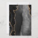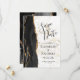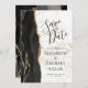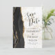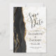 The left-hand edge of this elegant modern wedding save the date card features a black watercolor agate border trimmed with faux gold glitter. The customizable text combines black handwriting, copperplate and italic fonts on a gold and white marble texture background. The reverse side features a matching black and gold agate design.