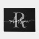 Girly Modern Elegant Stilvolle Schwarz-Grau Monogram Initial Family Name Script Custom Personalisiert Doormat. Dieses Design mit einem Familiennamen in einer hübschen Hand Schwanz-Schriftart-Kalligraphie (oder Typografie) mit Monogramm initial in grau und weiß auf schwarz. Große stilvolle feminine Hauswärmeschenke, auch zum Geburtstag, Hochzeit, Brautparty, Neuvermählte, Jubiläum, Junggeselinnen-Abschied und Es ist für das Mädchen, das schmiedet saubere minimalistische Dinge.