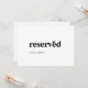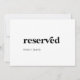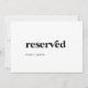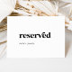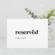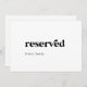 Dieses moderne, schwarze Typografie vorbehaltene Zeichen ist perfekt für eine einfache Hochzeit. Die Karte ist zweiseitig (beidseitig gedruckt). Das minimalistisch-schwarz-weiße Design besticht durch einen Retro-zeitgenössischen Schriftart mit einem einzigartigen böhmischen Ambiente. Ideal für jede Jahreszeit. Behalt es minimal, wie es ist, oder fügen Sie Ihre eigenen Grafiken und Kunstwerke. Benutzen Sie diese Karten, um Stühle oder Tische bei Ihrer Hochzeitsfeier, Empfang oder jeder Veranstaltung zu reservieren.