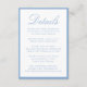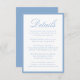 This wedding details card features “Details” in elegant light blue calligraphy, paired with classic serif typography for your accommodations, reception information, and wedding website. A light blue border frames the design with a crisp, airy finish that feels refined and timeless. The clean, structured layout offers a polished way to share important guest information while keeping your stationery look cohesive and elevated. Ideal for spring and summer weddings, coastal celebrations, and classic weddings, this insert card is easy to personalize with your event details.
