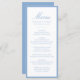 This wedding menu features soft light blue calligraphy at the top, paired with clean serif lettering for the couple’s names, wedding date, and dinner courses. The pale blue border adds a fresh, airy touch that feels perfect for spring, summer, and coastal weddings. With its crisp contrast and elegant layout, this menu card offers a bright yet polished way to display your dining details at each place setting.