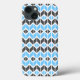 Dieses iPhone 13 Gehäuse zeichnet sich durch ein buntes geometrisches Herringbone-Muster in Blau, Dunkelgrau und Weiß aus.