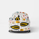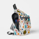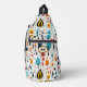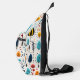 Auf dieser Tasche finden sich lustige Boho-Blätter, die sowohl für Groß als auch für Kleine attraktiv sind. Die Farben sind blau, gold, orange und dunkelmariniert auf weißem Hintergrund. In der Mitte befindet sich das dreifach schwarze Monogramm, das auf einem ovalen, schwarz und gold ausgekleideten Banner platziert ist. Bunt!